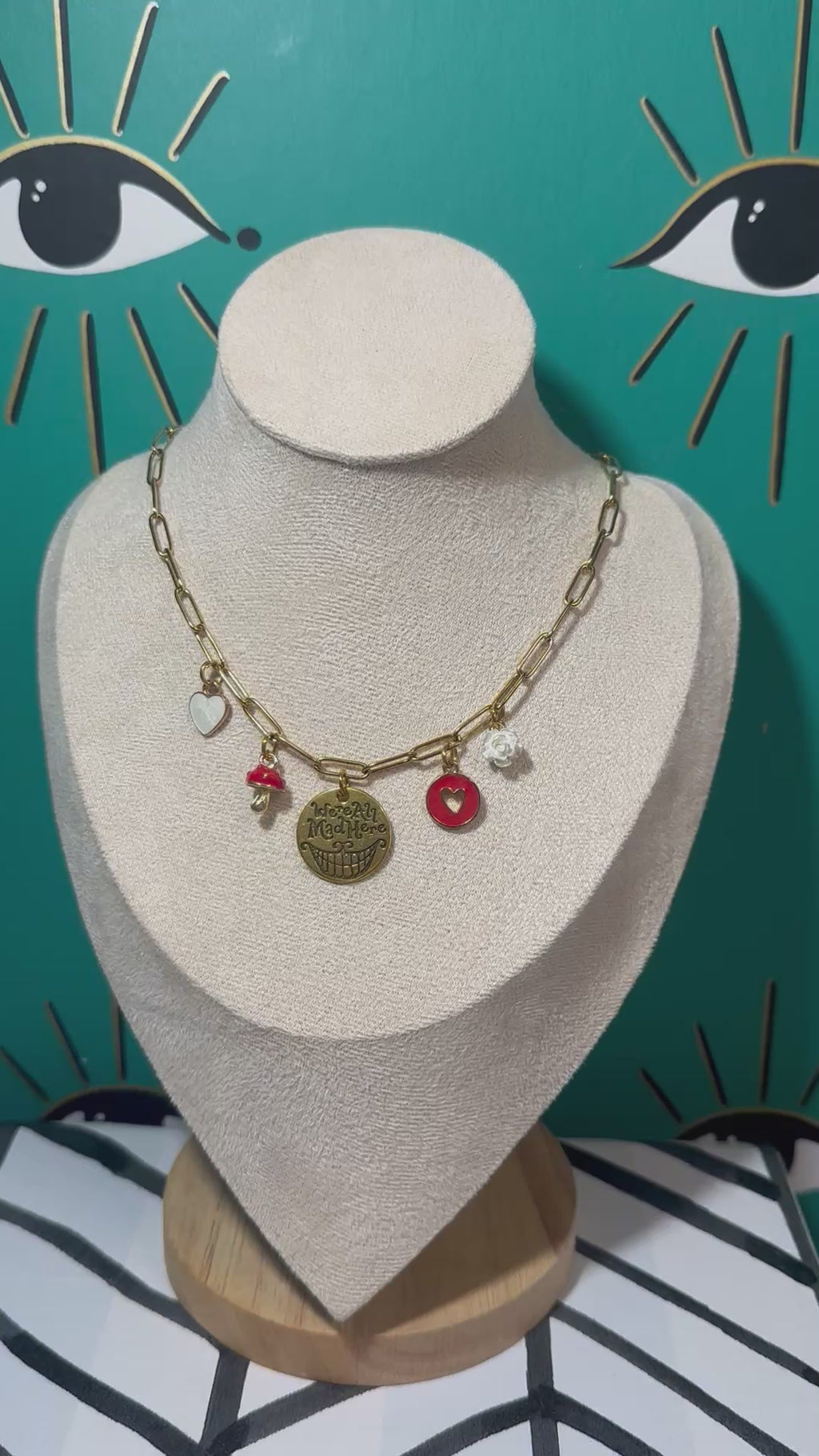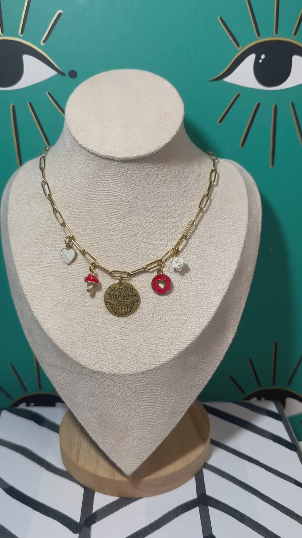 Step into the whimsical world of Alice in Wonderland with my “We’re All Mad Here” Multi-Charm Necklace!